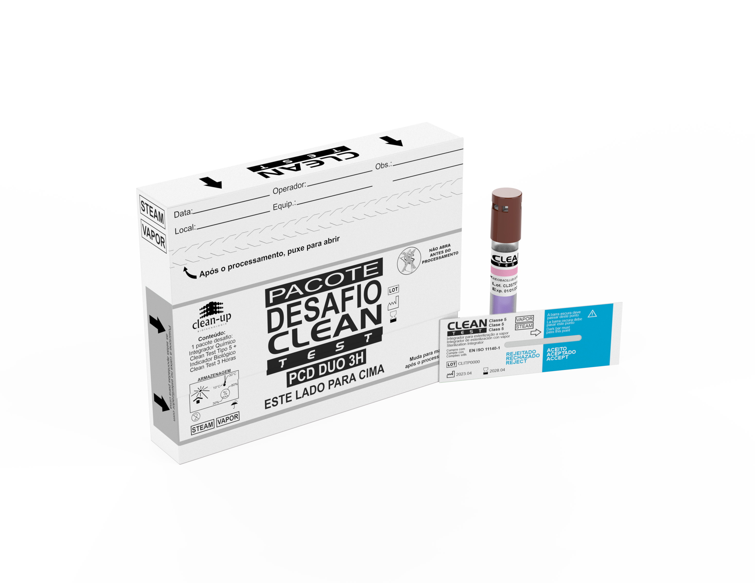 Este pacote é recomendado para o monitoramento e liberação de cada carga do esterilizador. Ele também pode ser usado para testes de qualificação do esterilizador e monitorização da eficácia do esterilizador de rotina, como especificado no ANSI/AAMI ST79. Dentro do pacote desafio Clean Test – DUO – 3Horas está incluído 1 (um) integrador pastilha Tipo 5, 1 (um) indicador biológico Clean Test e 1 (um) indicador biológico Clean Test controle. Ideal para a liberação de carga imediata em situações de emergência utilizando o resultado do integrador apoiado pelo resultado do indicador biológico.